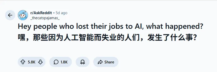 2025年10月,Reddit上一个看似粗浅的问题激勉了热议:“那些因AI失去使命的东谈主,发生了什么?”