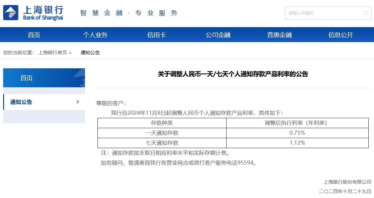 10月30日金融一线音讯,据上海银行官网,自2024年11月8日起,上海银行更始东说念主民币个东说念主奉告入款居品利率。具体如下: 一天奉告入款更始后推行利率(年利率)为0.75%;7天奉告入款更始后推行利率(年利率)为1.12%。而该行最新“存贷款利率”栏目(2024-10-23 起推行)袒露欧洲杯投注入口,该行东说念主民币一天/七天个东说念主奉告入款居品利率区别为0.1%和0.45%。