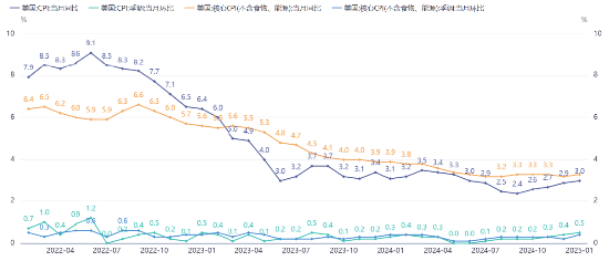 2. 2月12日,好意思国劳工局公布1月份CPI数据。好意思国2025年1月未季调CPI同比3.0%,高于预期值和前值2.9%,贯串4个月反弹;中枢CPI同比3.3%,高于预期值3.1%和前值3.2%,自2024下半年以来基本走平。季调后CPI环比0.5%,高于预期值0.3%,是2023年9月以来最高;中枢CPI环比0.4%,高于预期值0.3%,是2023年5月以来最高。
